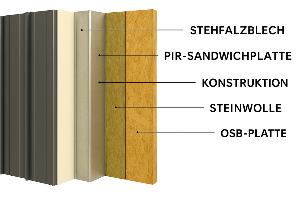 - PIR-Sandwichplatte – garantiert hervorragende Wärmedämmung dank eines niedrigen Wärmeleitwertes (λ ≈ 0,022–0,024 W/mK).